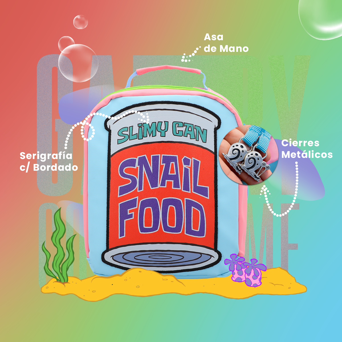 Lleva tu lunch con estilo en nuestra lonchera con diseño de la lata de alimento de Gary, fiel amigo de Bob Esponja. Con cierre metálico de fácil apertura, interior aislado y correa ajustable, mantendrá tu comida fresca y segura. ¡No te quedes sin ella!