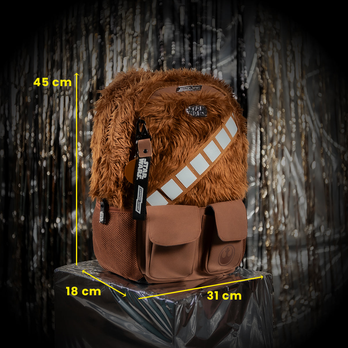 La mochila Chewbacca cuenta con detalles de la placa metálica de Star Wars, bolsas frontales y laterales para un fácil acceso y almacenamiento, respaldo y tirantes ergonómicos para una comodidad óptima. Además, incluye un compartimento interno para laptop y un llavero coleccionable. Ideal para fanáticos de Star Wars y para llevar todo lo necesario con organización y estilo.